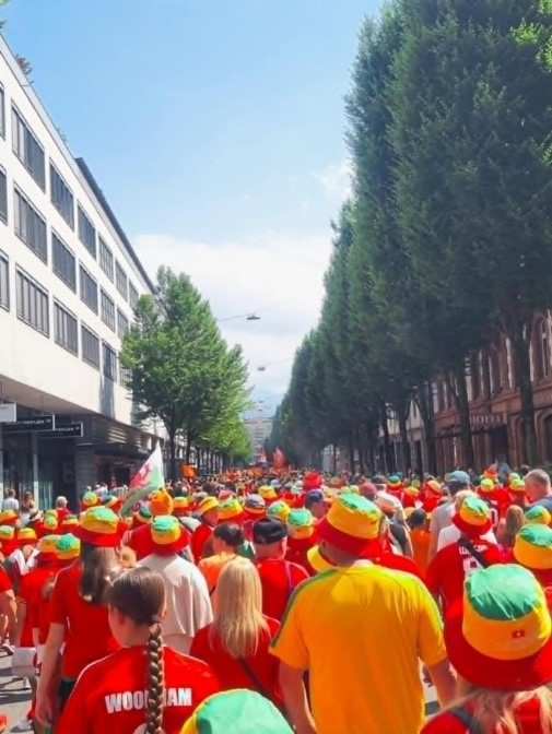 Roedd 4,000 o gefnogwyr yn Luzern, ac ar strydoedd y ddinas fe wnaeth bob un a gerddodd heibio roi ‘nod’ gyfeillgar o’r pen i’w gilydd. 800 milltir i ffwrdd o Gymru, ac roedd strydoedd Luzern yn dod ag unigolion o bob rhan o’r wlad at ei gilydd fel hen ffrindiau. Ar ôl i’r gêm ddod i ben, teithiodd bysiau o gefnogwyr yn ôl i’r Fanzone gan ganu’r holl ffordd – o’r anthem i Galon Lân ac i gân Mr Urdd. Ni ddaeth y dathliadau i ben am oriau, efo gig Adwaith mewn tafarn yn creu cymuned llawn ffrindiau a'r iaith Gymraeg .