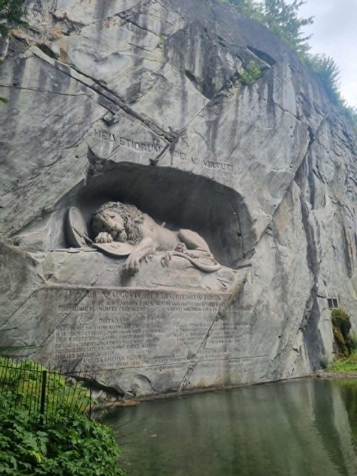 Fel hanesydd, roedd hefyd apêl i ddarganfod tipyn o’r hanes lleol yn y Swistir ac Orkney. Roedd cofeb llew nodedig i’w gweld yn y dref. Yn ystod y Chwyldro Ffrengig a gyrhaeddodd i’r Swistir, lladdwyd 800 o filwyr byddin y Swistir wrth amddiffyn y brenin ym Mharis, ac yn 1821 agorwyd y gofeb ar ei cyfer. Mae’r gofeb o fewn gardd ddistaw llawn coed a phwll gyda physgod i greu ardal heddychlon i weld y llew â gwyneb trist.