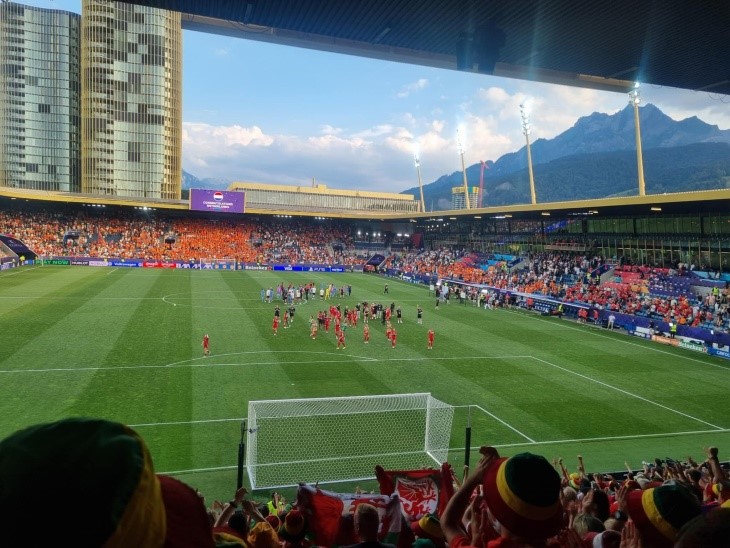 Erbyn 2025, mae gymaint wedi newid. Wrth gwrs, dyma’r flwyddyn gyntaf erioed i dîm merched Cymru gyrraedd pencampwriaeth fawr, ond hefyd roedd y gemau ar gael i’w gwylio ar y teledu am ddim, gyda sylwebaeth Gymraeg a Saesneg. Wrth i’r dyfarnwr chwythu’r chwiban olaf y gêm gymhwyso yn Iwerddon, aeth fy meddwl yn syth i’r Swistir – doeddwn i ddim am fethu’r profiad hwnnw. Ond, penderfynais deithio i’r gêm gyntaf yn erbyn yr Iseldiroedd yn unig achos yr wythnos wedyn roedd cystadleuaeth ryngwladol arall yn digwydd; Gemau’r Ynysoedd.